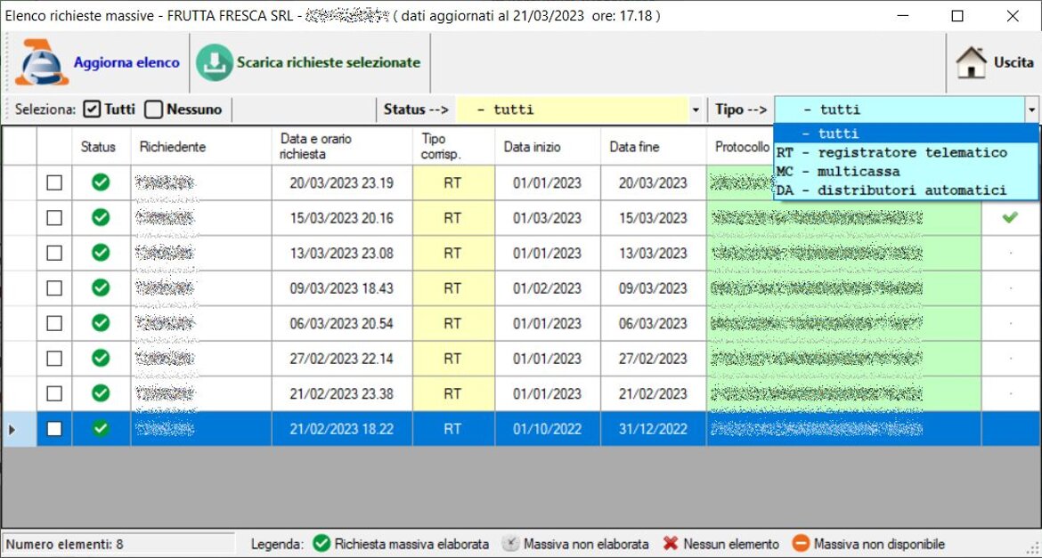 Gestione puntuale e automatica delle richieste massive dei corrispettivi con possibilità di consultazione e download delle richieste in essere